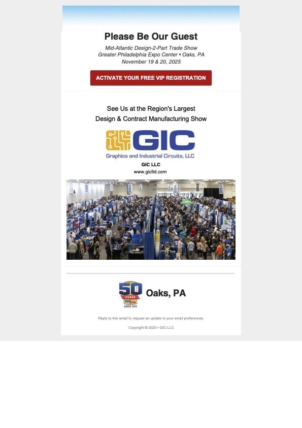 GIC, LTD is excited to announce that we’ll be exhibiting at the Design-2-Part Show in Oaks, Pennsylvania, one of the region’s premier manufacturing trade events. You can find us at Booth 111, where we’ll be showcasing our precision manufacturing solutions, advanced PCB assembly capabilities, and engineering expertise.